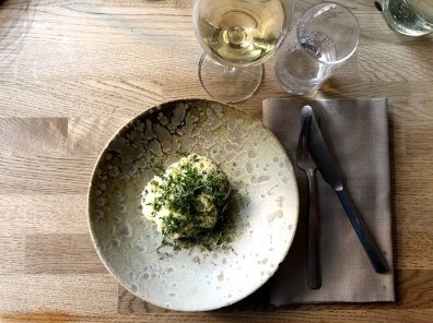 syltede salatløg, luftig rygeost, puffet kartoffel, ramsløg og karse