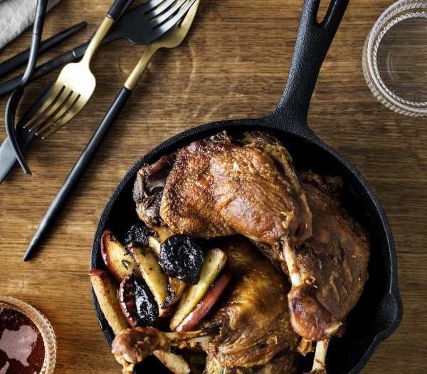 Bryst og lår af and med rødkål, bagt æble med tyttebær, små ristede kartofler, brune kartofler og andeskysauce